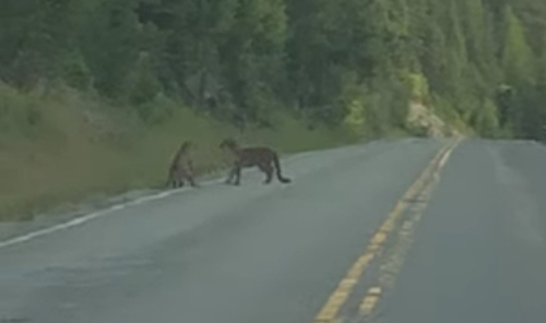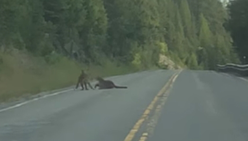То ли эти две пумы что-то не поделили и решили подраться, то ли это была всего лишь игра с отработкой боевых навыков, но в любом случае животные избрали для своего занятия проезжую часть.